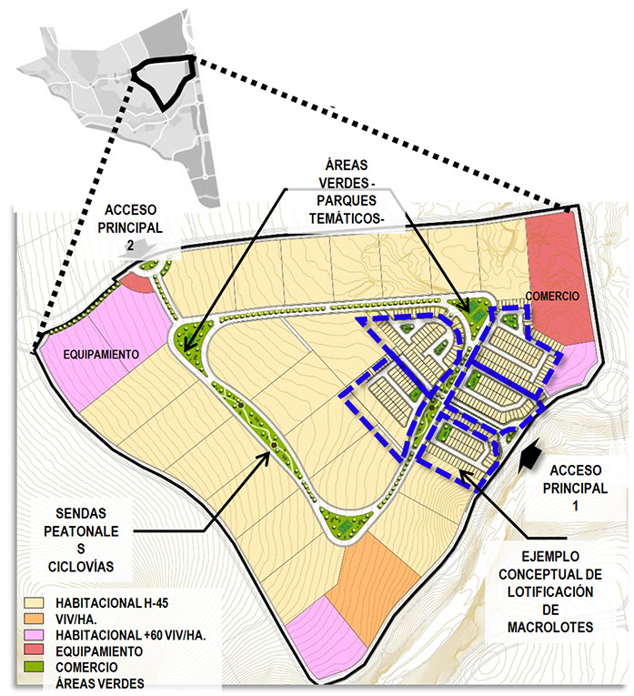 La propuesta en esta primera etapa consiste en 26 Macrolotes Habitacionales con superficies variables de 1 a 2 Has., los cuales se comercializarán con promotores de vivienda.